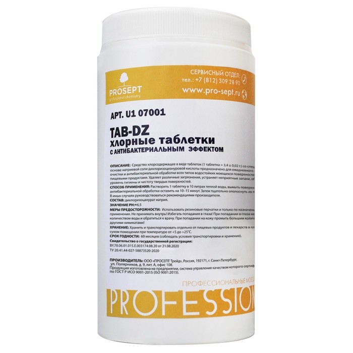 Хлорные таблетки с антибактериальным эффектом Prosept – средство на основе натриевой соли дихлоризоциануровой кислоты, предназначенное для ежедневного и периодического мытья, очистки и антибактериальной обработки всех типов водостойких моющихся поверхностей, не имеющих контакта с пищевыми продуктами.