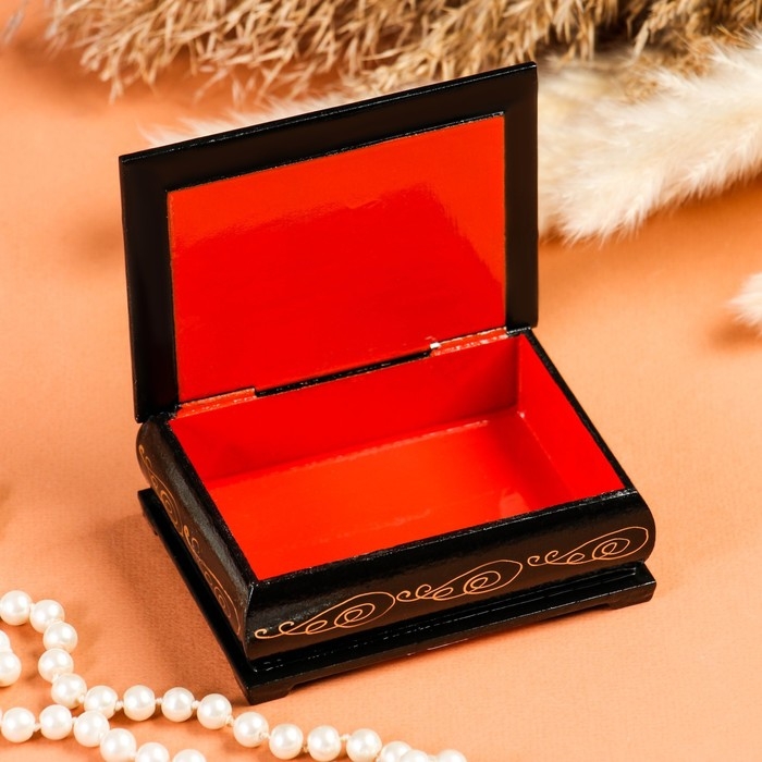 Шкатулка изготовлена из дерева, покрыта краской. Заранее напечатанное изображение приклеено и покрыто лаком. Дополнительно мастер наносит узор.