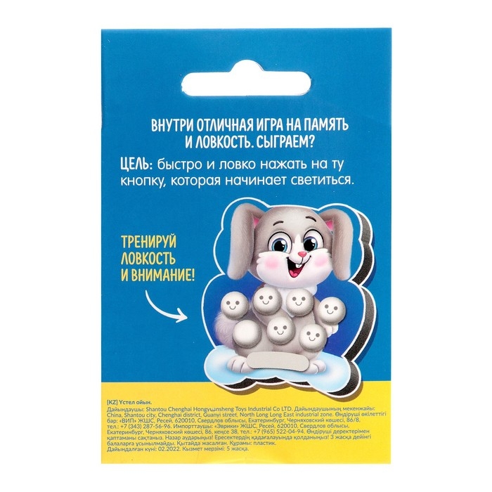 «Ловкий заяц» — настольная игра для детей от 3 лет. Озороной зайчишка подготовил увлекательное развлечение для маленького непоседы. С такой настолкой ребёнок весело проведёт время, тренируя ловкость и внимание. Забавные кнопочки в виде мордочек привлекут внимание малыша и прокачают моторику.