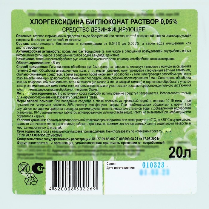 Хлоргексидина биглюконат раствор 0,05% средство дезинфицирующее, 20 л