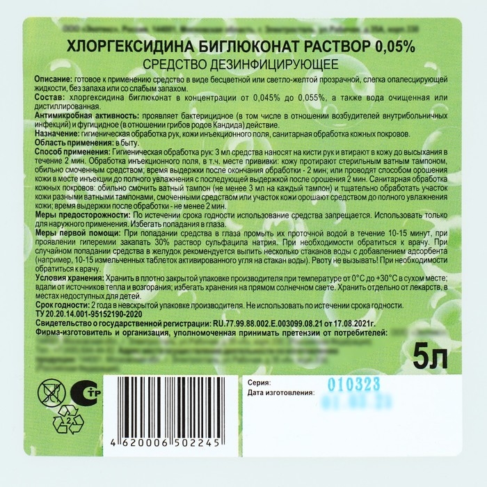 Хлоргексидина биглюконата водно-спиртовой дезинфицирующий раствор 0,5%, 5 л