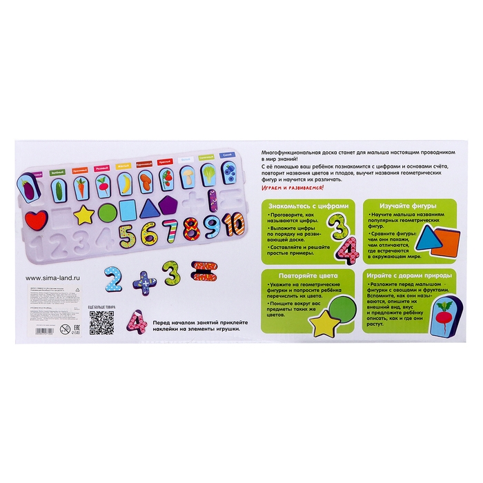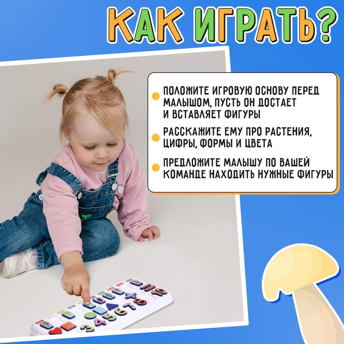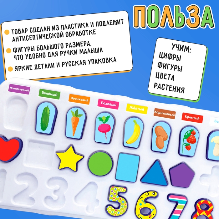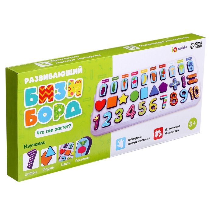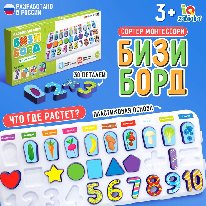 Развивающий бизиборд «Что где растёт?» — это многофункциональная доска, с помощью которой ребёнок познакомится с цифрами и основами счёта, повторит названия цветов и плодов, выучит названия геометрических фигур и научится их различать.