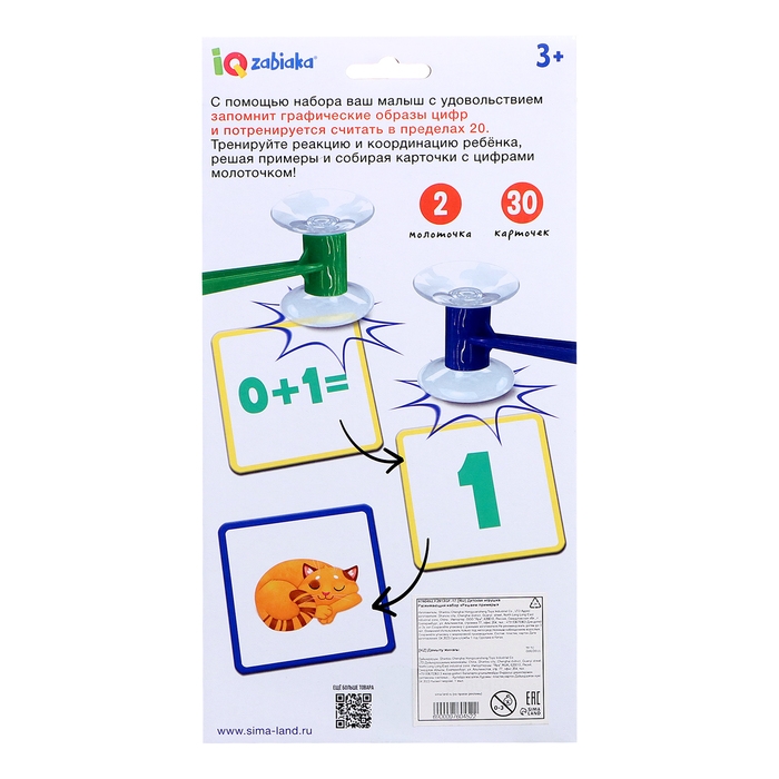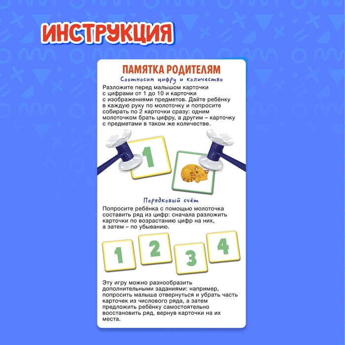 Тренируйте логическое мышление и память, реакцию и координацию ребёнка, решая примеры и собирая карточки с цифрами молоточками.