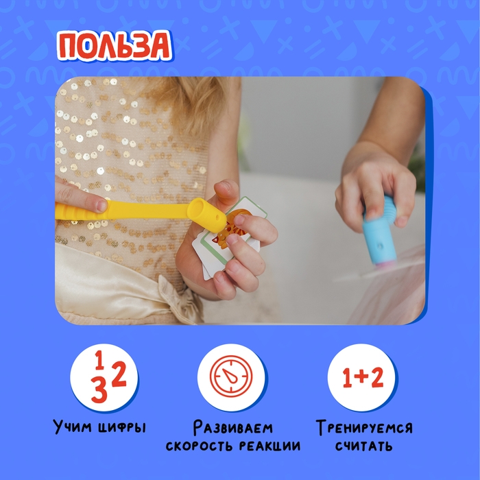 - Дайте ребёнку в каждую руку по молоточку и попросите собирать по 2 карточки сразу: одним молоточком брать цифру, а другим — карточку с предметами в таком же количестве.