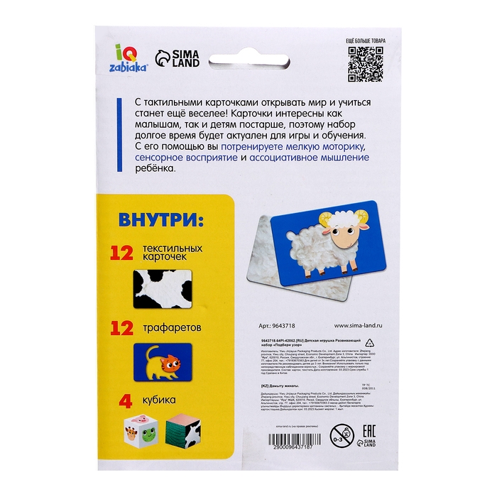Внутри вы найдёте 12 текстильных карточек, 12 трафаретов, 4 кубика и памятку для родителей.