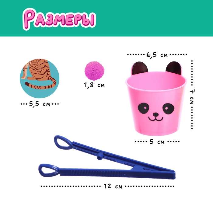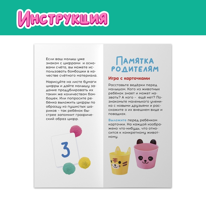 Внутри вы найдёте набор цветных бомбошек, 20 карточек, 5 ведёрок, пинцет и памятку для родителей.