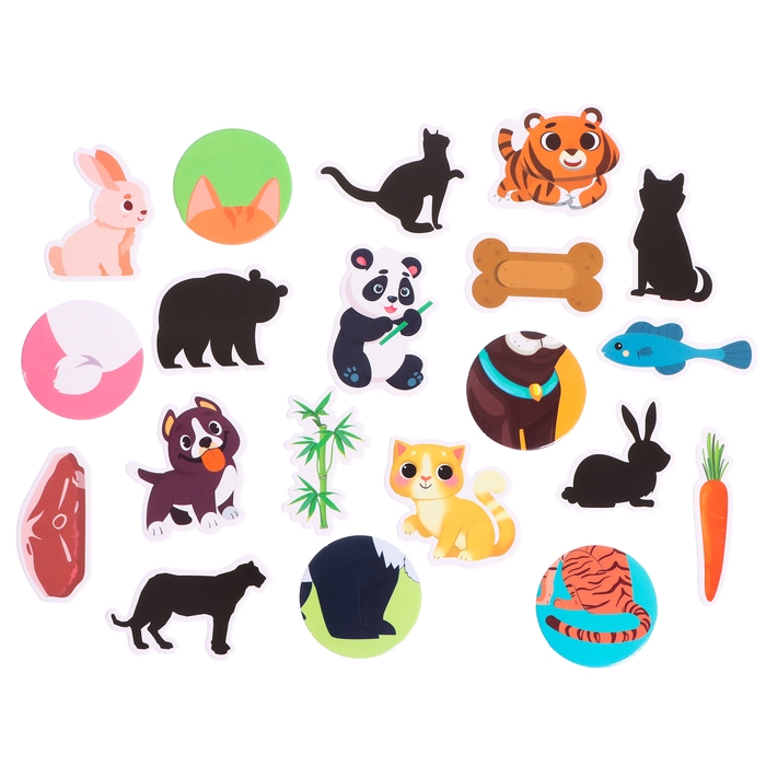 - Выложите перед ребёнком карточки. На каждой изображено что-нибудь, что относится к конкретному животному. Попросите малыша разложить их по ведёркам с мордочками.
