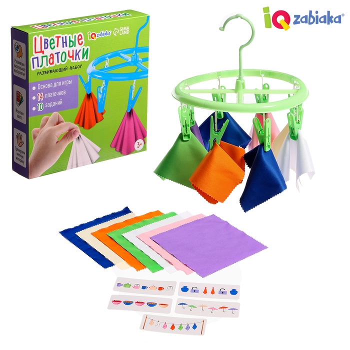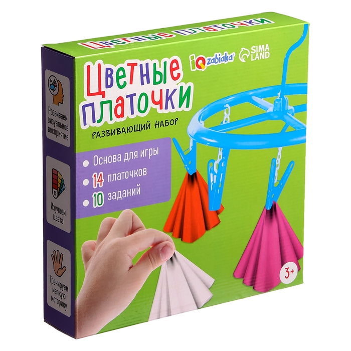 Развивающий набор «Цветные платочки» поможет малышам от 3 лет повторить названия цветов, научиться сравнивать предметы и потренировать ловкость пальчиков и ручек.