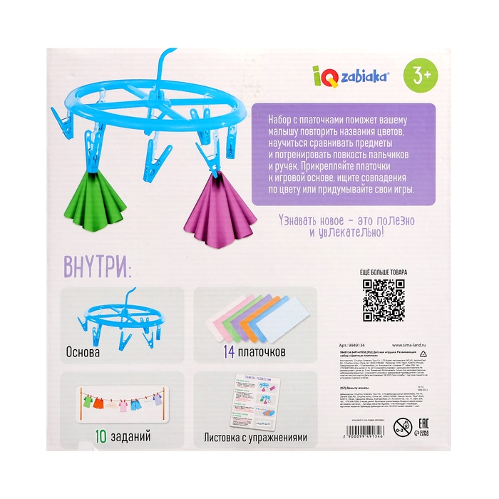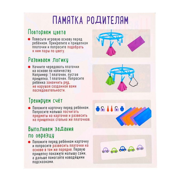 - Выполняйте задания по образцу: положите перед ребёнком карточку и попросите развесить платочки на основе в том же порядке. Первую прищепку покажите малышу сами, а дальше помогайте наводящими подсказками.