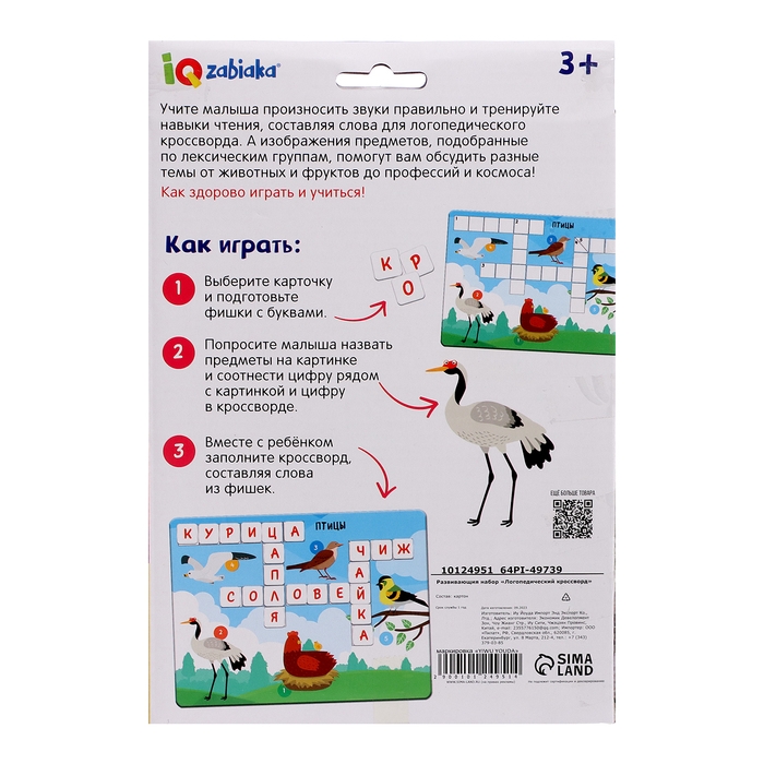 «Логопедический кроссворд» — развивающий набор для детей от 3 лет. Такое развлечение научит малышей произносить правильно звуки «Р» и «Л», а также потренировать чтение, составляя слова для логопедического кроссворда и расширит словарный запас. Изображения предметов помогут вам обсудить разные темы от животных и фруктов до профессий и космоса. Внутри вы найдёте набор фишек, 20 увлекательных кроссвордов и брошюру с ответами.