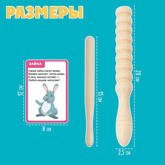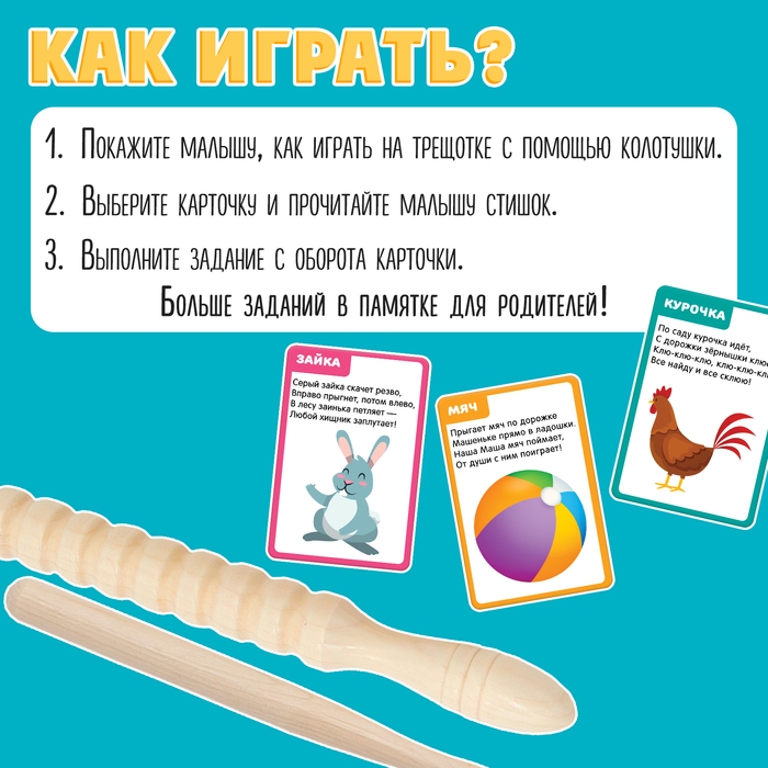 Внутри вы найдёте колотушку, трещотку и 5 двусторонних карточек с потешками и заданиями.
