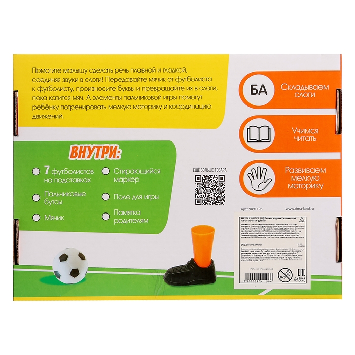 Развивающий набор «Речевой футбол» поможет сделать речь малыша плавной, ребёнок научится соединять звуки в слоги. Передавайте мячик от футболиста к футболисту, произносите буквы и превращайте их в слоги, пока катится мяч. А элементы пальчиковой игры помогут ребёнку потренировать мелкую моторику и координацию движений.