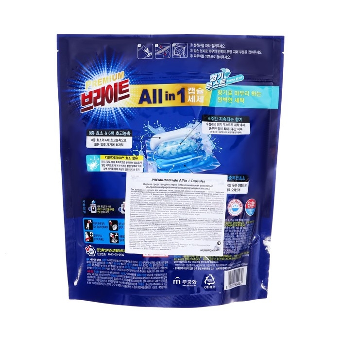 Капсулы MUKUNGHWA "Феноменальная свежесть" обладают приятным ароматом, который остается на вещах после стирки. Они подходят для всех типов тканей и цветов, что делает их универсальным решением для любой стирки.