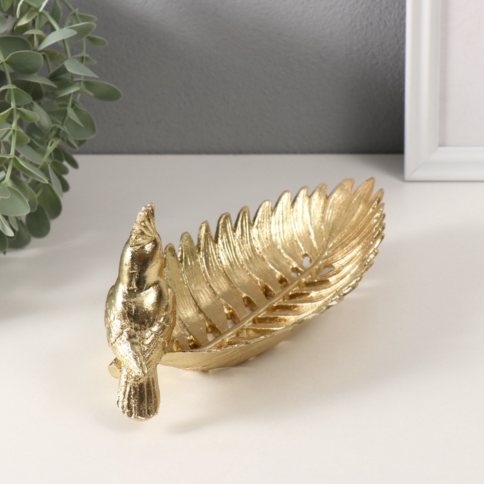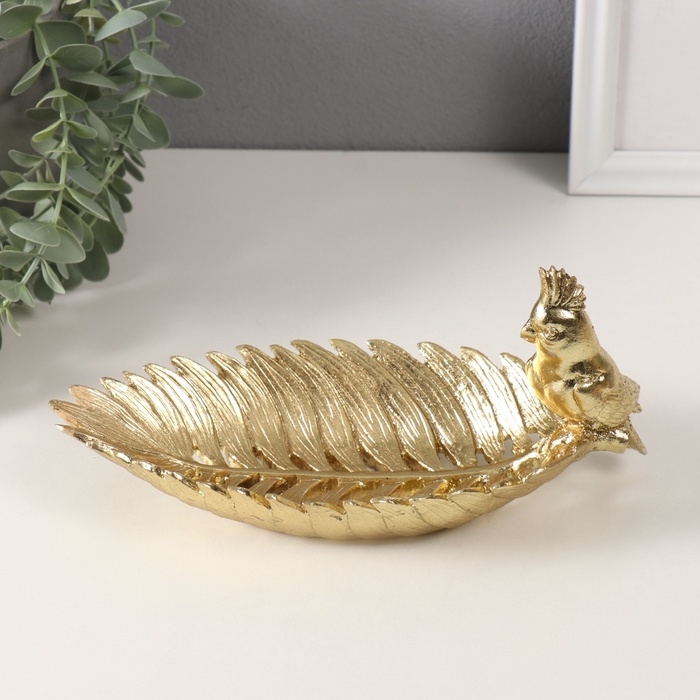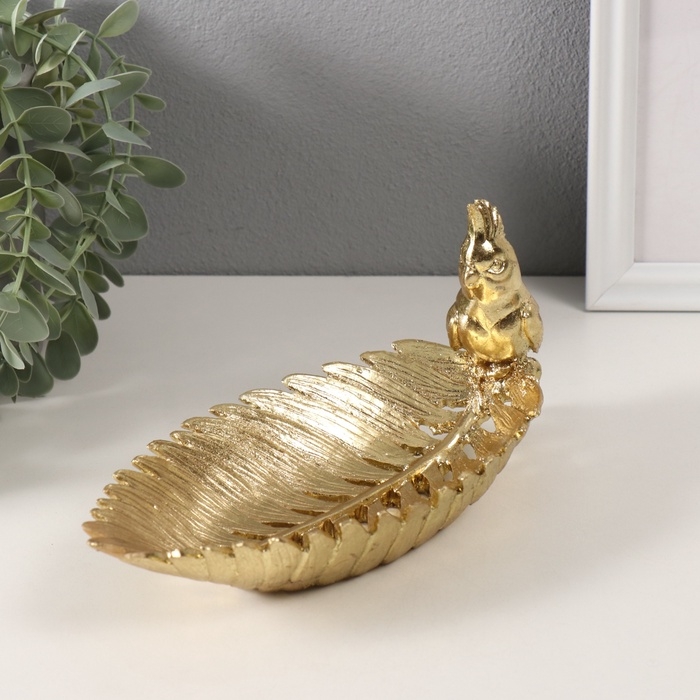 Сувенир полистоун подставка "Золотой попугайчик с хохолком на золотом листе" 11х24,5х11 см