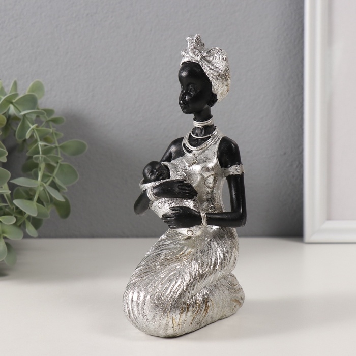 Сувенир полистоун "Африканка с ребенком, в серебристом платье" 11х7,5х18 см