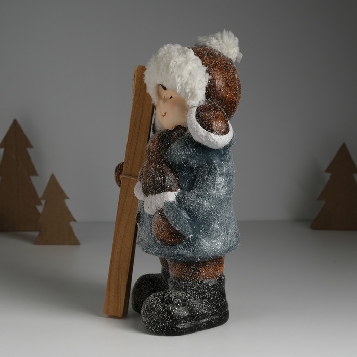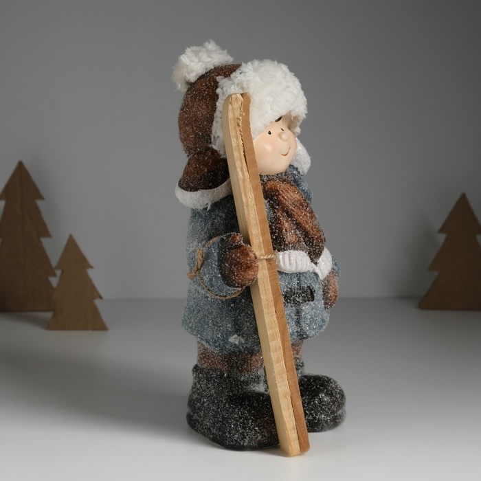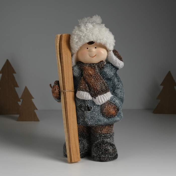 Сувенир керамика "Малыш в сером пальто и шапке ушанке, с лыжами" 13х9,5х23 см