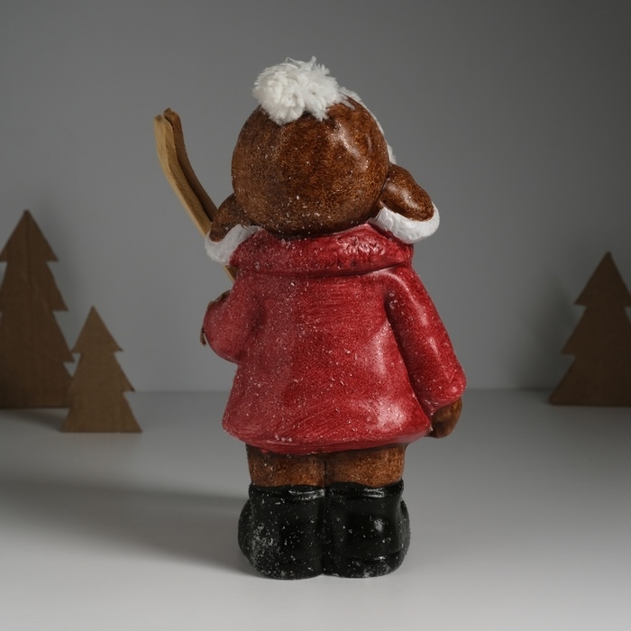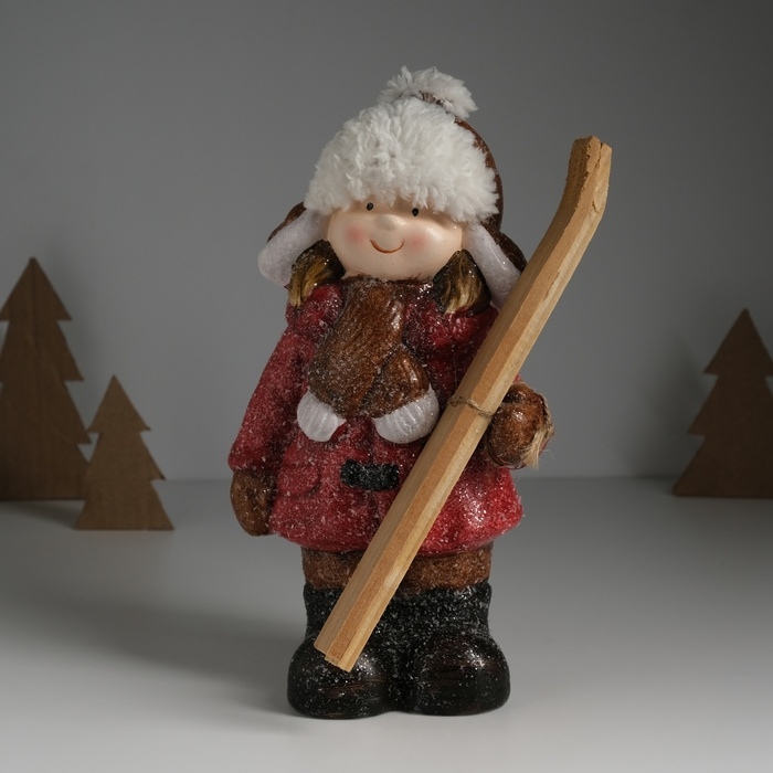 Сувенир керамика "Малышка в красном пальто и шапке ушанке, с лыжами" 13х9,5х23 см