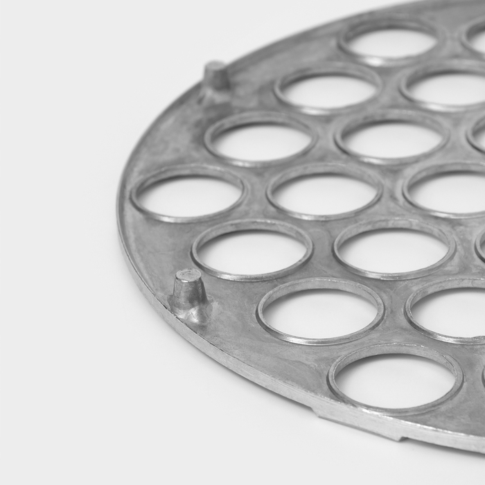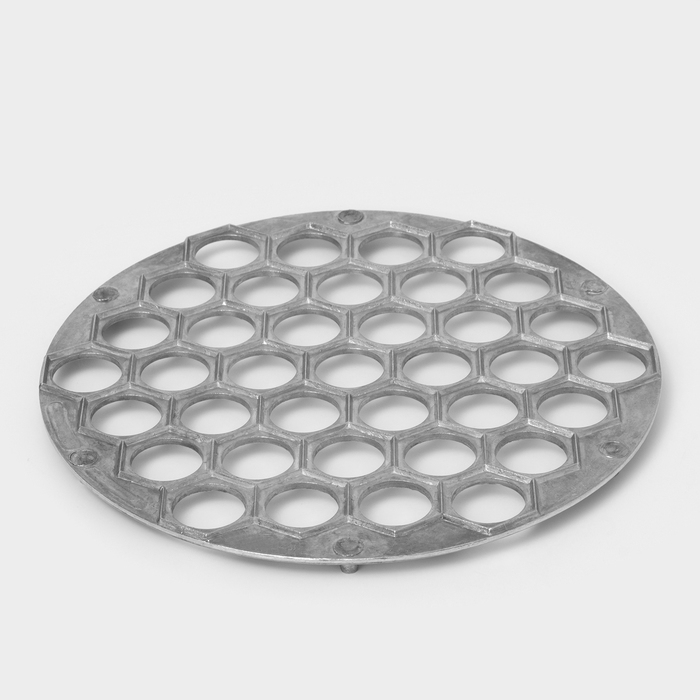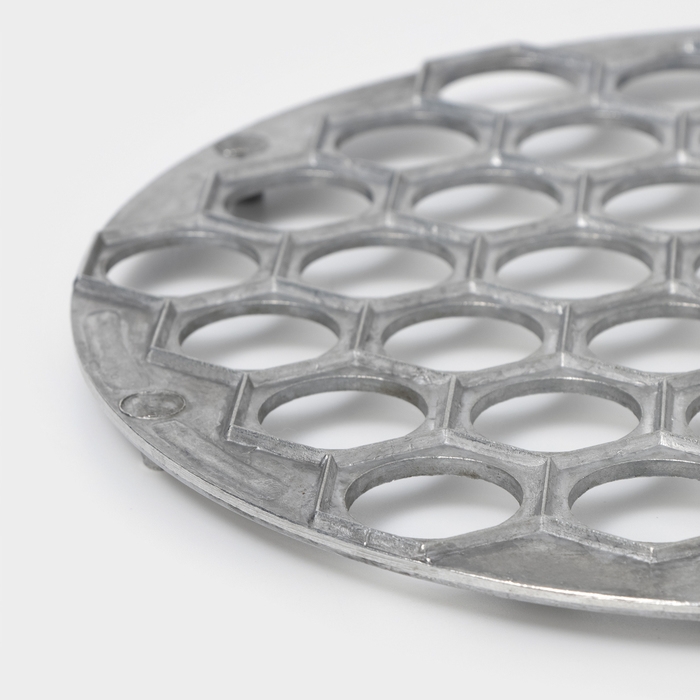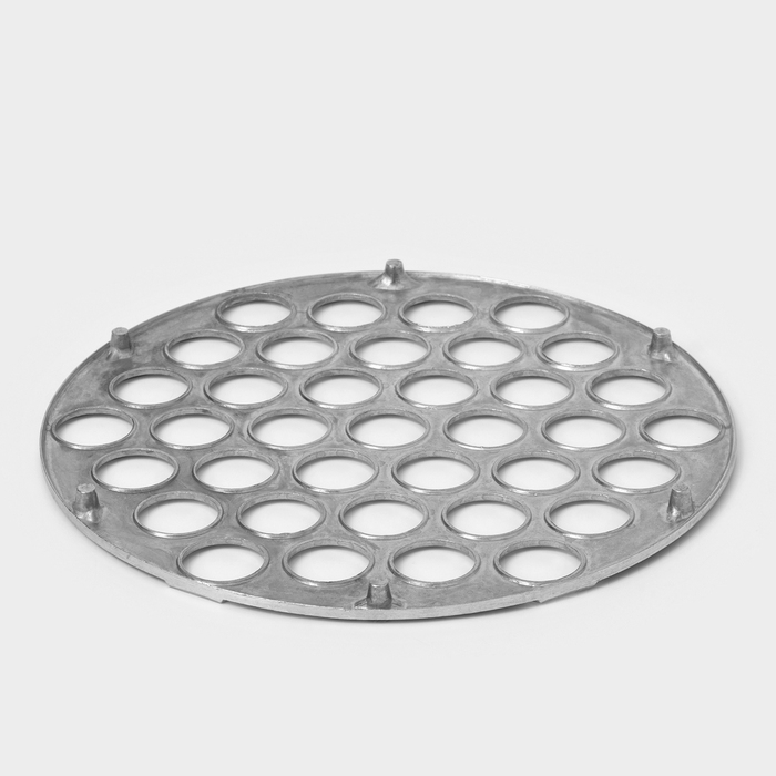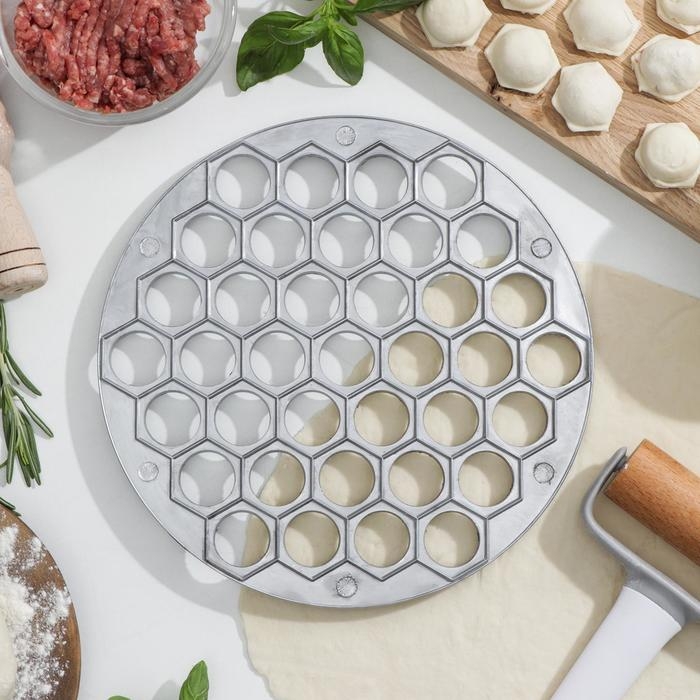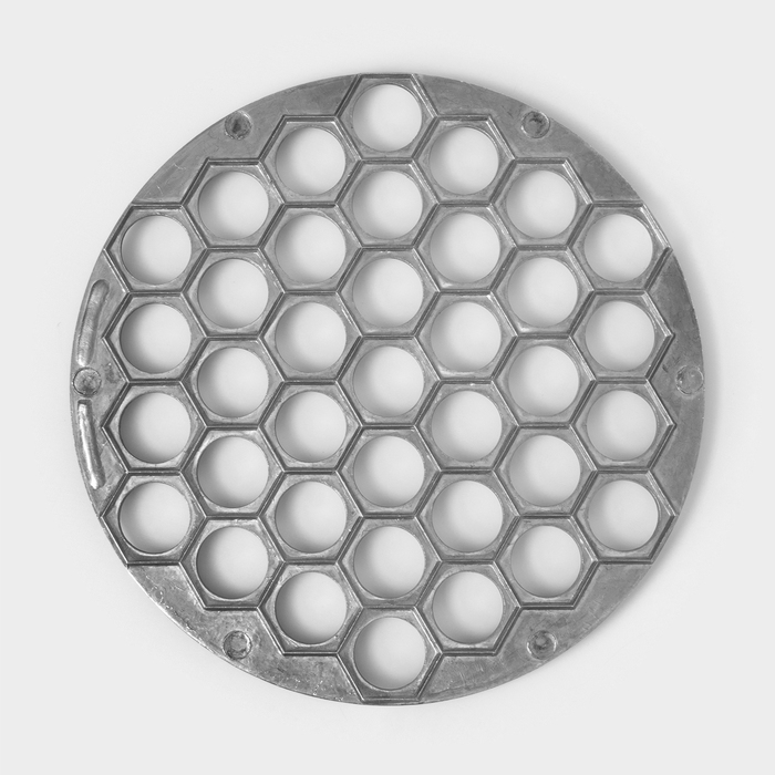 Пельменница представляет собой круглую металлическую форму с аккуратными ячейками на небольших ножках. На выходе получаем 37 одинаковых, идеально ровных пельмешек.