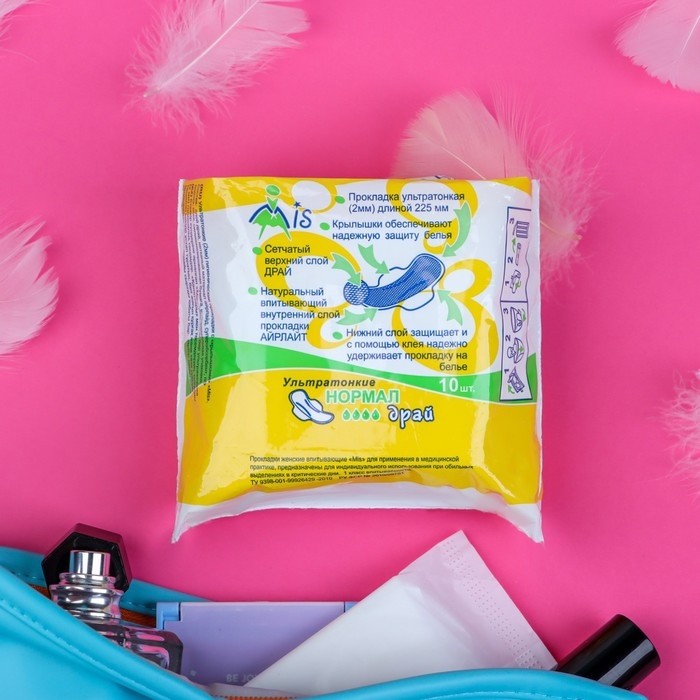 Описание: прокладки ""Mis"" Ультратонкие, Normal Dry, 10 шт Прокладки MIS ультратонкие (3 мм) нормал драй с боковыми крылышками, длиной 225 мм с внутренним впитывающим слоем «Аэрлайд», который надёжно впитывает жидкость, удерживая и превращая её в гель. Верхний слой драй – сеточка из тысяч воронкообразных отверстий, зауженных снизу, благодаря чему влага проникает вглубь прокладки, а её поверхность остаётся сухой. Мягкие крылышки служат надёжной защитой от протеканий и дополнительной фиксацией прокладки на белье.