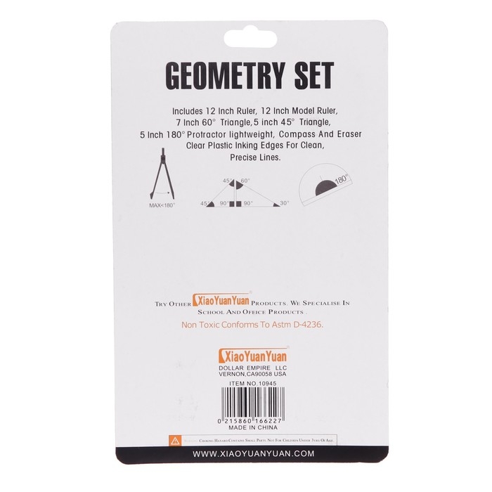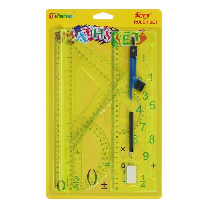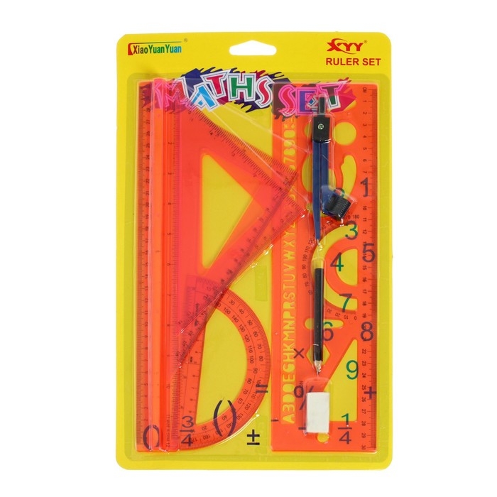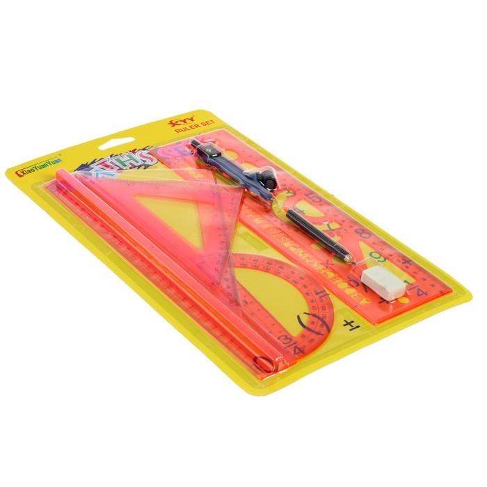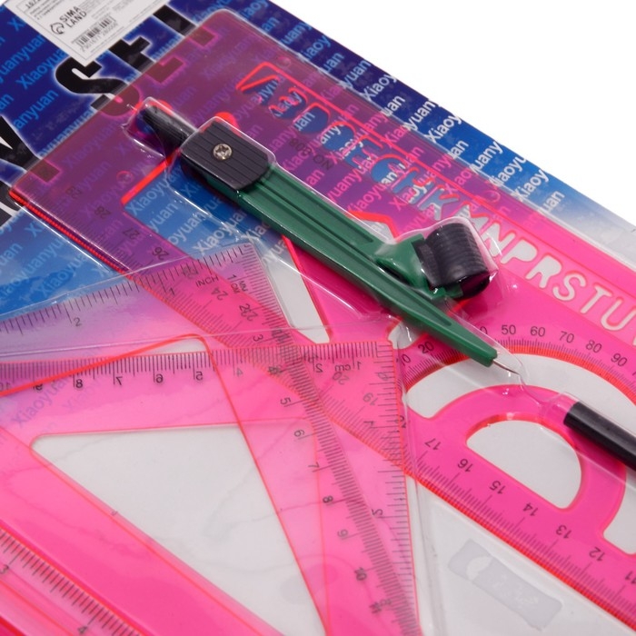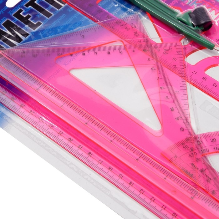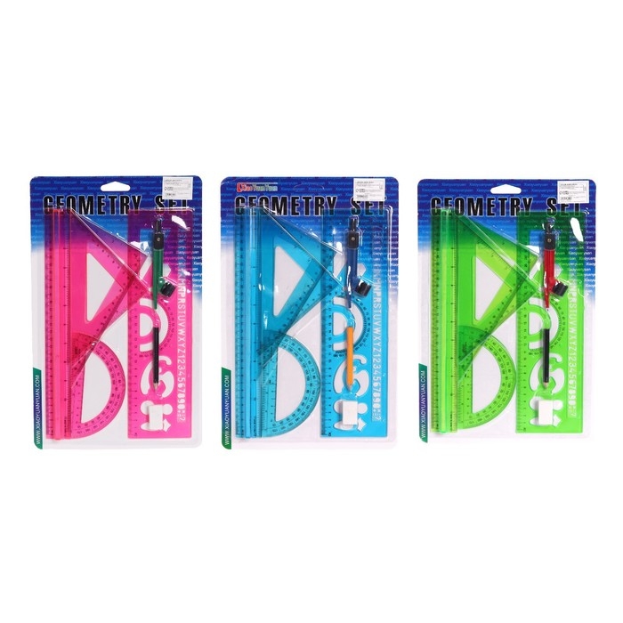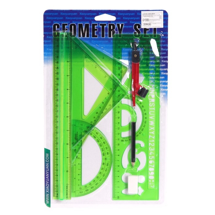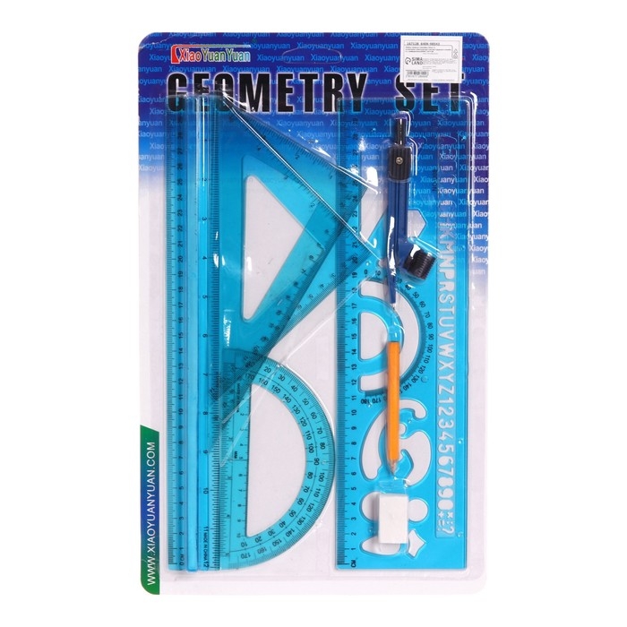 В комплекте: линейка 30 см, 2 треугольника, транспортир, ластик, циркуль, линейка с трафаретами.