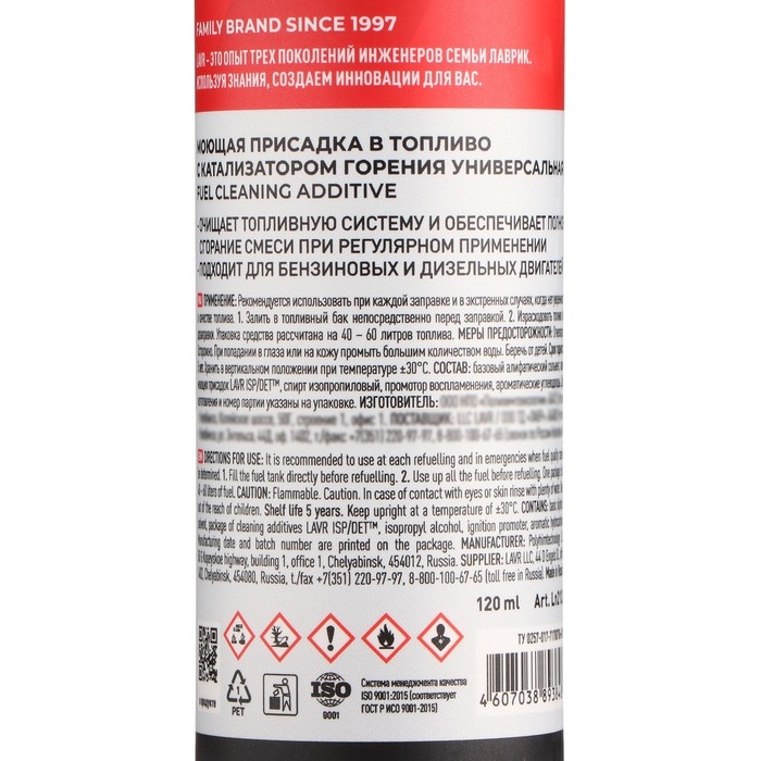 Присадка в бензин моющая LAVR с катализатором горения, на 40-60 л, 120 мл, Ln2126