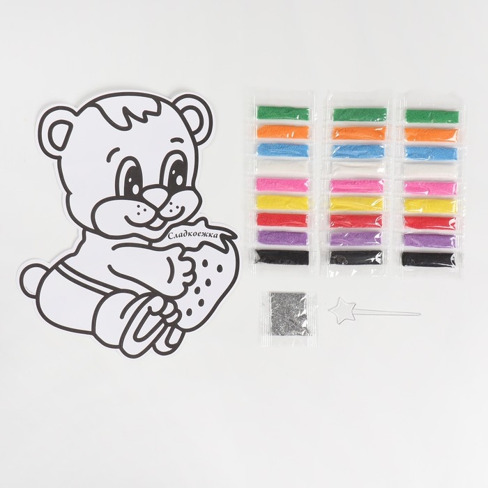 Фреска «Сладкоежка», 9 цветов песка - это увлекательный вид творчества, который понравится любому малышу. Клеевая основа защищена специальным слоем бумаги, на который нанесены прорезные контуры. Каждый цвет находится в своей зоне: отделяйте верхний слой с помощью стеки и засыпайте песком подходящего цвета. Специальные контуры не дадут разноцветным частичкам перемешаться и помогут с легкостью создать маленький песочный шедевр. Засыпайте картинку постепенно и не забывайте распределять мелкие песчинки по клеевому слою, чтобы добиться особой яркости изображения.