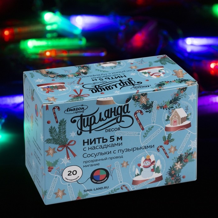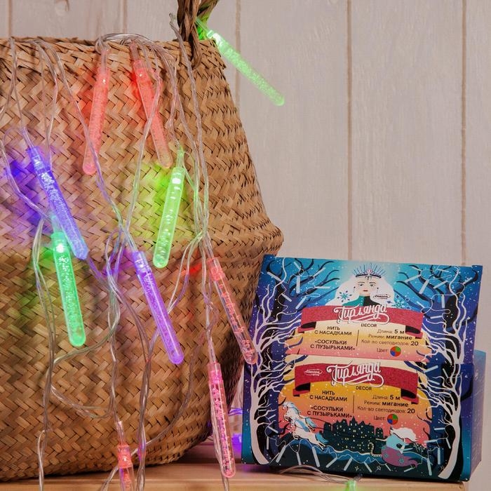 Гирлянда «Нить» 5 м с насадками «Сосульки с пузырьками», IP20, прозрачная нить, 20 LED, свечение мульти (RG/RB), мигание, 220 В