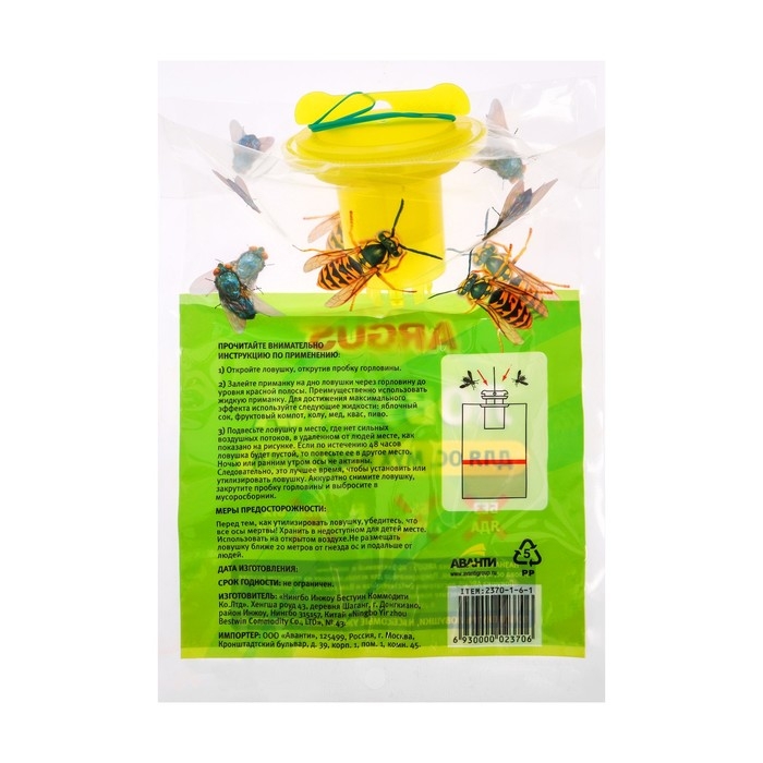 Ловушка Argus — эффективный и экологически чистый способ отлова ос, мух. Без яда и химии.Ловушка предназначена для использования на открытом воздухе. Просто разместите её с небольшим количеством приманки в отдалении от людей. Попав внутрь, насекомые уже не смогут выбраться.Ловушка Argus достаточно вместительная, и хватит её на целое лето. Прочитайте полностью инструкцию по применению:Откройте ловушку, открутив пробку горловины.Залейте приманку на дно ловушки через горловину до уровня красной полосы. Преимущественно использовать жидкую приманку: яблочный сок, фруктовый компот, квас, кока-колу, мед и т. д.Повесьте ловушку в место, где нет сильных воздушных потоков, в удаленном от людей месте.Если ловушка по истечению 48 часов будет пустой - разместите ее в другом месте. Ночью или ранним утром осы не активны - это лучшее время для того, чтобы установить или утилизировать ловушку.Перед тем как выбросить ловушку, убедитесь, что все осы мертвы.Состав:Прибор не содержит химических препаратов, способных повредить человеку, домашним животным или экологии. Производитель позаботился и о внешнем виде, придав ловушке привлекательный и современный внешний вид. Стенки изготовлены из пластика, устойчивого к воздействию окружающей среды и механическим повреждениям.
