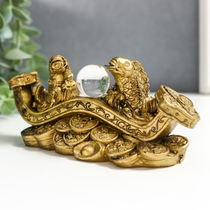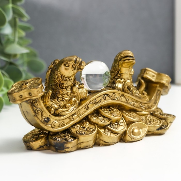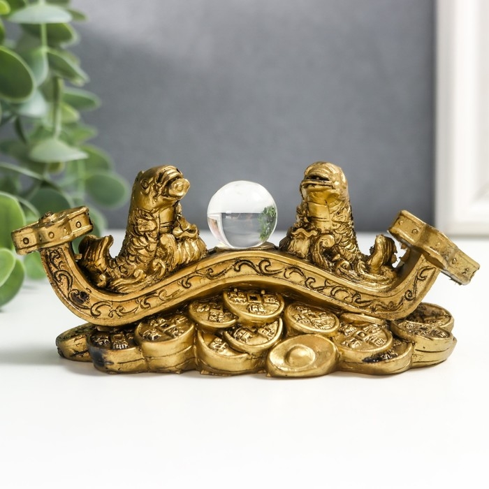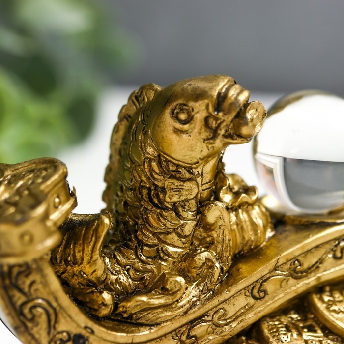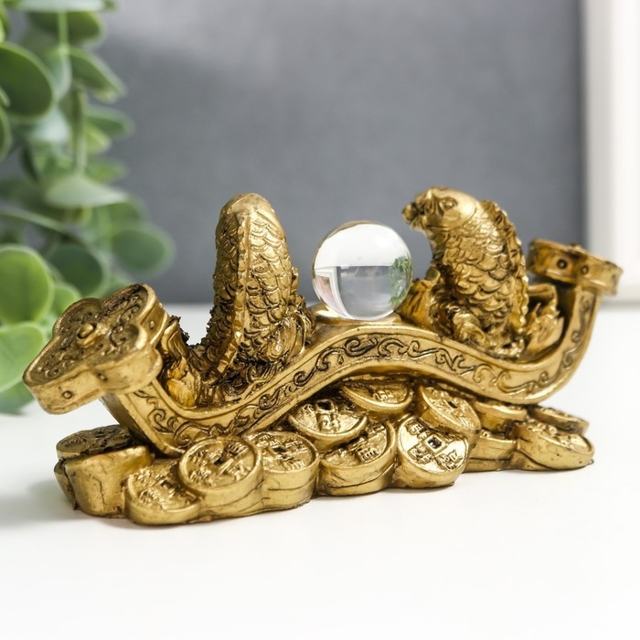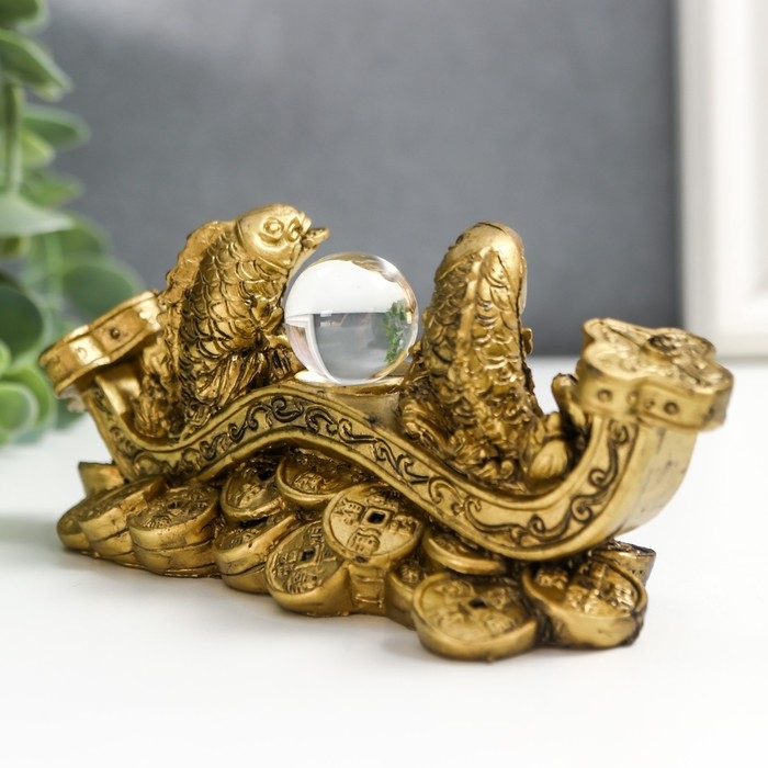 Нэцке полистоун под бронзу "2 карпа на жезле Жуи с кристаллом" 5х4,5х12,5 см