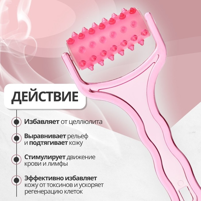 Шипованный ролик обеспечивает приток крови к коже, разгоняет лимфу, снимает отёки. Благодаря массажёру кожа получает питание и приходит в тонус, становится гладкой и эластичной, улучшается её цвет.