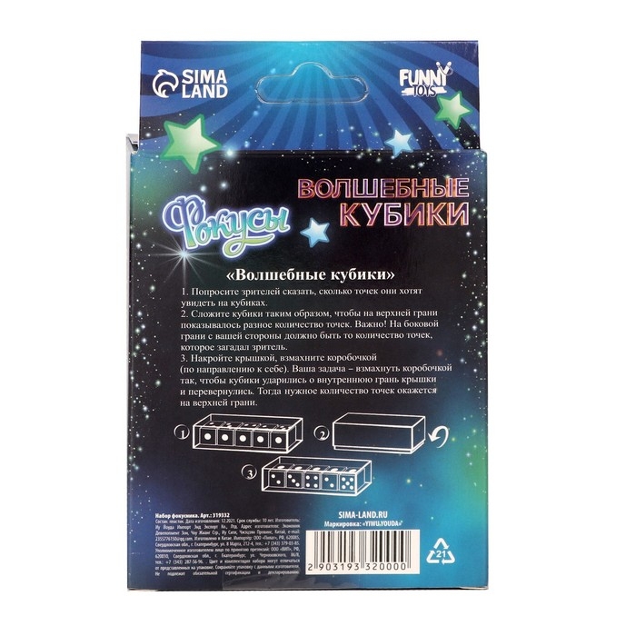Зритель загадывает любое количество точек на кубике. Фокусник укладывает кубики в коробочку в совершенно произвольном порядке. Коробочка закрыта, взмах коробочкой и все кубики перевернулись к верху именно тем числом точек, которое выбрал зритель.