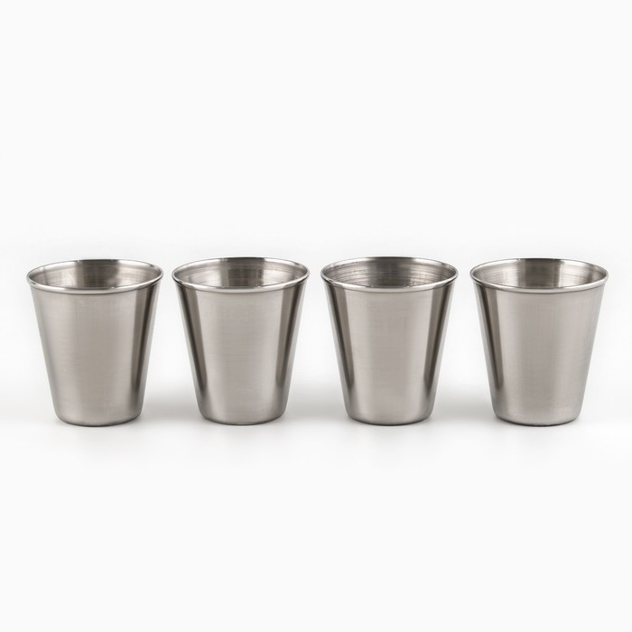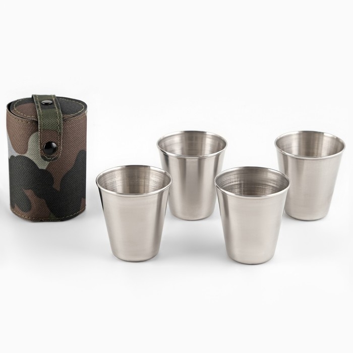 Набор стопок из 4 штук по 70 мл из пищевой нержавеющей стали в компактном чехле. Легкие и компактные, удобно брать с собой на отдых, рыбалку, охоту, природу или в путешествия.