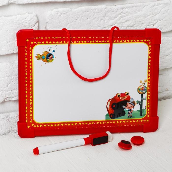 Односторонняя доска с яркой рамкой станет для юного творца отличным помощником в увлекательных занятиях рисованием. Она красочная с веселыми картинками. Доска предназначена для рисования на ней водным маркером, который входит в набор. Также в комплекте есть 2 магнитика, с помощью которых можно прикреплять к доске всё, что захотите – рисунки, картинки, обучающие материалы! Доска оснащена петлей, за которую её можно подвесить для удобства занятий.
