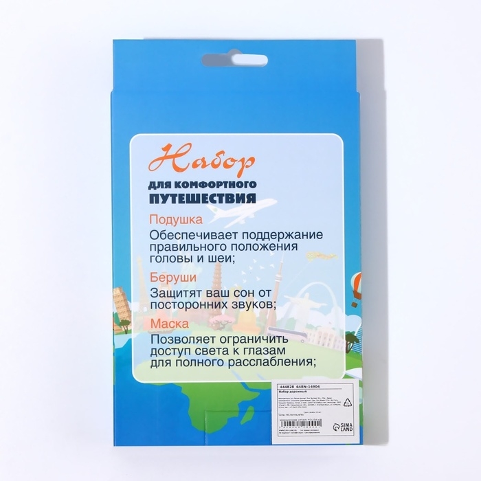 Перед тем, как отправиться в путешествие, позаботьтесь о том, чтобы дорога до места назначения прошла быстро и с комфортом. Всё для вашего крепкого сна вы найдёте в этом наборе: подушка-воротник позволит вам удобно устроиться в салоне машины или самолёта; с берушами вы не услышите ни гул мотора, ни шум двигателей; маска для сна поможет быстро заснуть, и дорога пройдёт незаметно.
