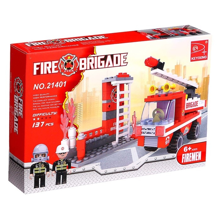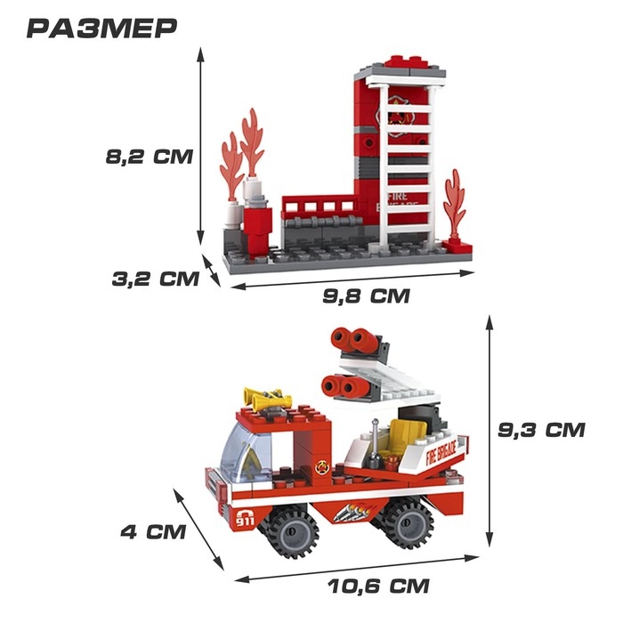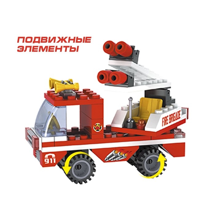 Набор содержит 133 детали и позволяет сконструировать пожарную часть, функциональный автомобиль спецслужбы и фигурки огнеборцев.