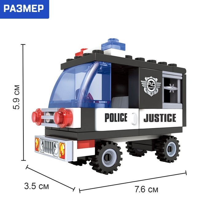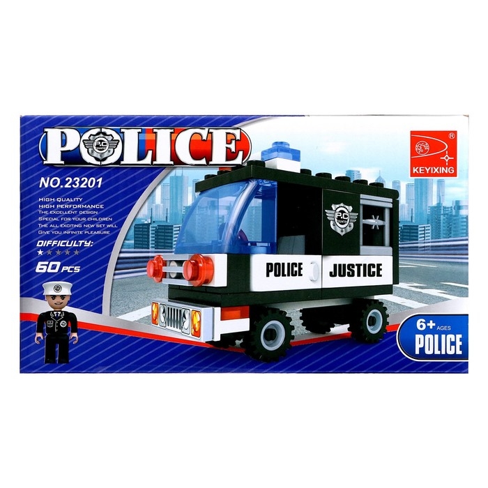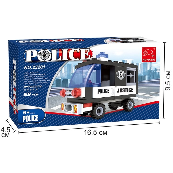 - Из 58 деталей ребёнок сконструирует патрульный автомобиль и фигурку полицейского.