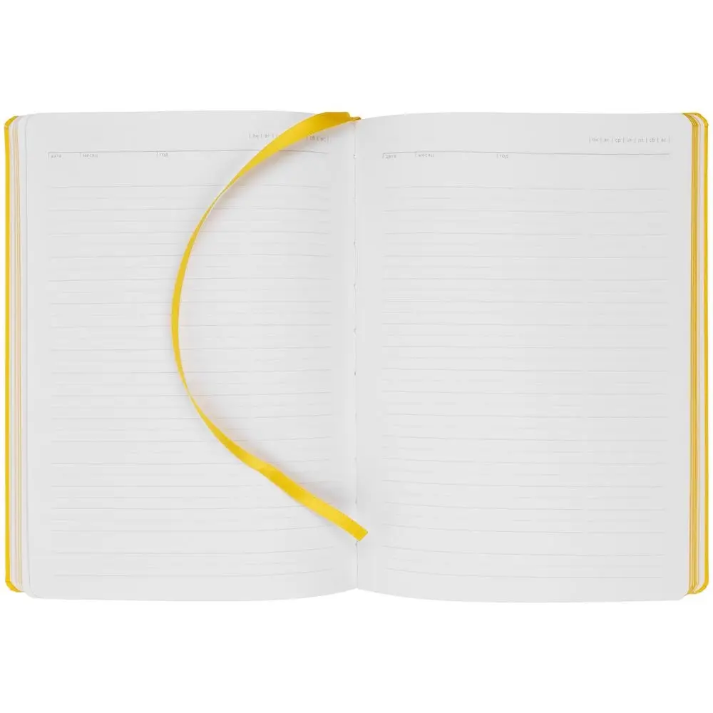 Ежедневник с твердой обложкой. Выполнен из материала Latte, желтый, дополнен ляссе в цвет обложки.
