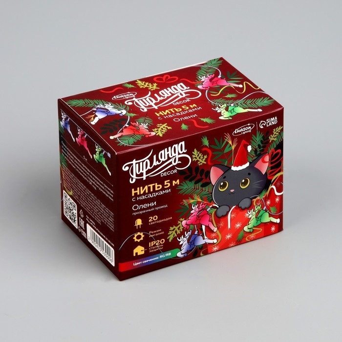 Гирлянда «Нить» 5 м с насадками «Олени», IP20, прозрачная нить, 20 LED, свечение мульти (RG/RB), мигание, 220 В