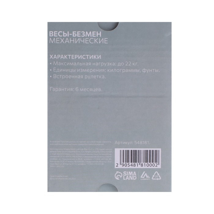 Механический безмен поможет вам узнать массу продуктов. Прибор обладает высокой точностью, надёжен и прост в применении: подвесьте груз на крючок и на шкале отобразится вес продукта (максимум 22 кг).