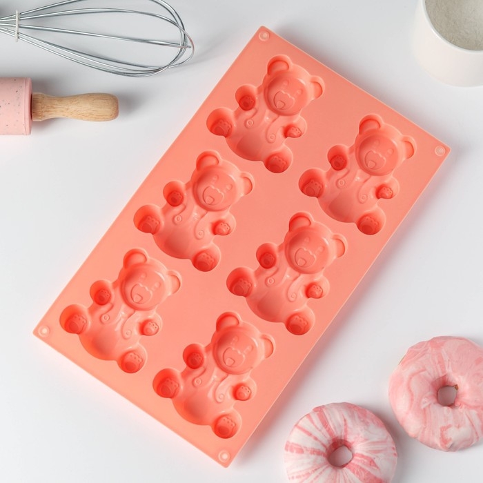 Форма для выпечки Доляна «Животные. Мишка», силикон, 28,5×17 см, 6 ячеек (8,5×7 см), цвет оранжевый