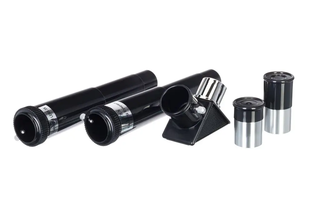 - Окуляры в комплекте: H6 мм (50х), H20 мм (15х), оборачивающий окуляр 1,5х; линза Барлоу 3х
