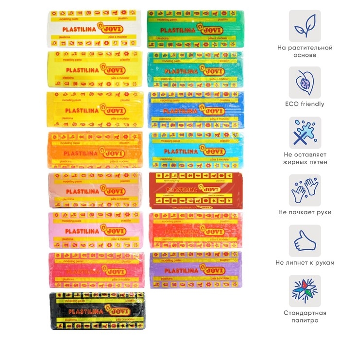 Благодаря усовершенствованной формуле с воском пластилин JOVI безопасен, обладает повышенной пластичностью, хорошо лепится, прекрасно держит форму, не деформируется, легко извлекается из формочки, не крошится, не высыхает, цвета прекрасно смешиваются между собой, слепленные фигурки не опадают со временем. Используется для техники "Рисование пластилином" и пластилиновой мультипликации.