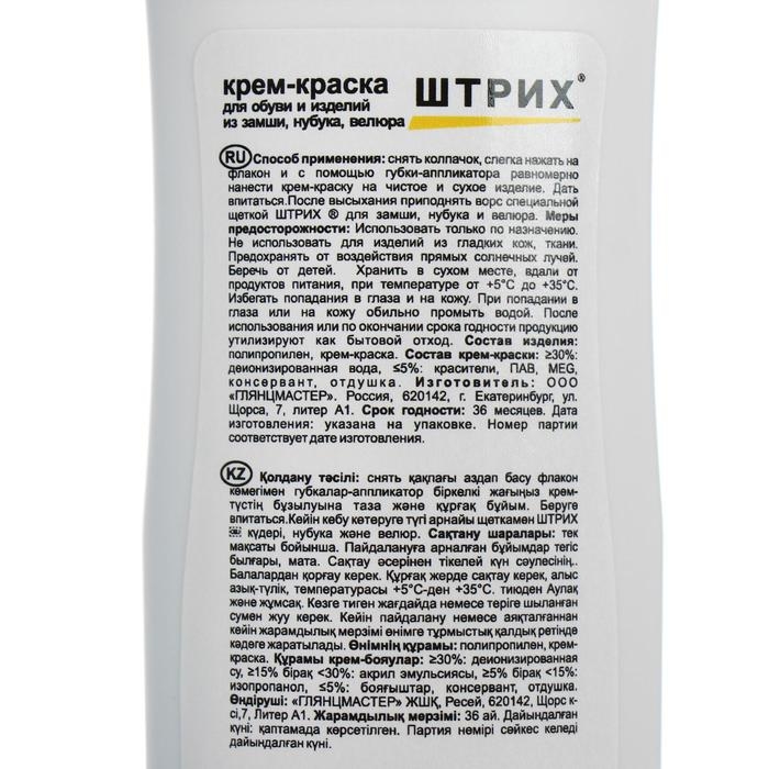 Крем-краска от торговой марки «Штрих» защищает обувь от негативного воздействия внешней среды, моментально обновляет поверхность, закрашивает потёртые места и царапины, не нанося вреда структуре материала.