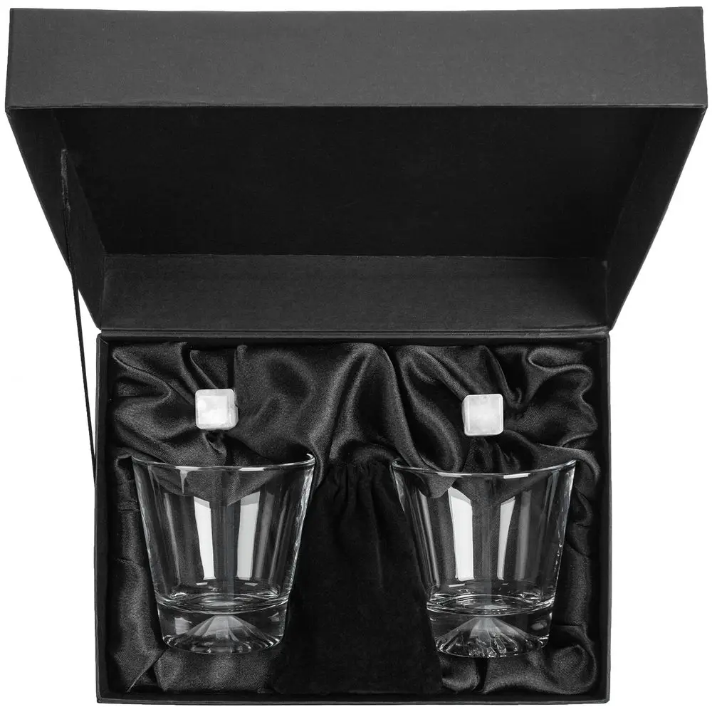 В наборе: 2 бокала, 6 камней для охлаждения напитка, бархатный мешочек для удобного хранения камней, подарочная коробка.
