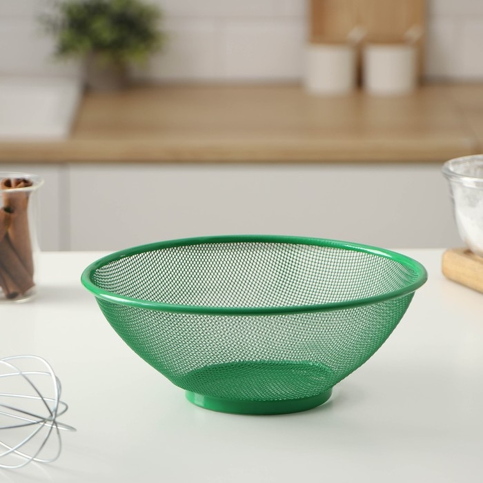 Прочная металлическая сетка поможет избавиться от крупных инородных тел и тщательно промыть содержимое. Яркие цвета делают изделие привлекательным, а прочный металлический ободок гарантирует прочность конструкции и защищает её от деформации.