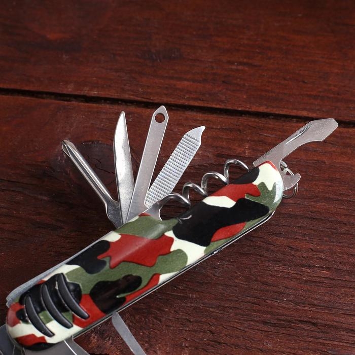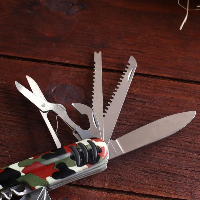 Нож швейцарский Камуфляж 12в1 можно охарактеризовать двумя словами – удобный и функциональный. Такой перочинный нож станет для вас незаменимым помощником, например, дома, в паходе или на пикнике. Потому что вы будете обладать арсеналом самых необходимых инструментов. С их помощью непростая ситуация разрешится в два счета.