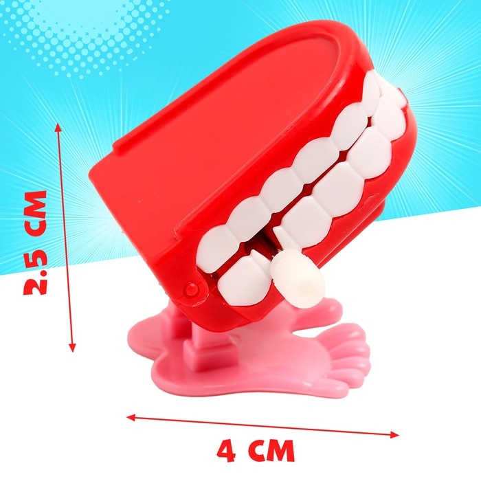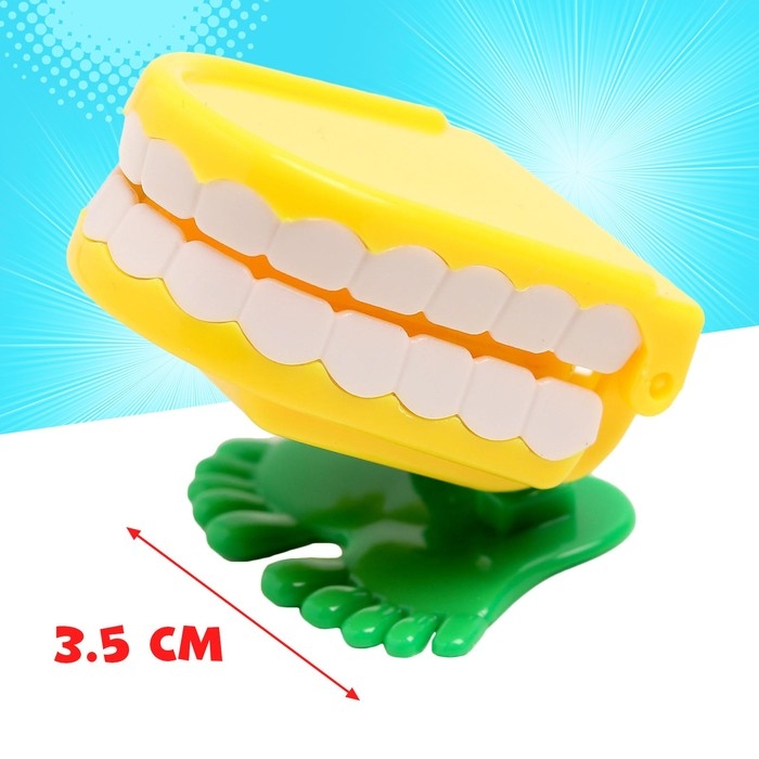 Заводная прыгающая игрушка развеселит детей и позабавит взрослых на вечеринке. Забавные челюсти на ножках двигаются от заводного механизма. Чтобы они заработали, их нужно просто завести и отпустить: игрушка резко устремится вперёд.