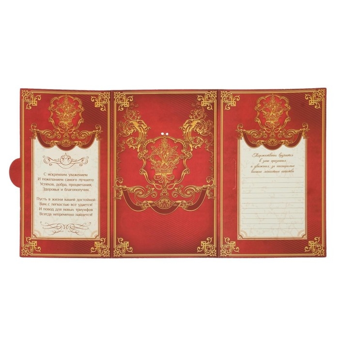 Награда аккуратно размещена на картонной подложке с поздравлением, наполненным тёплыми словами, и дополнена нарядной лентой.