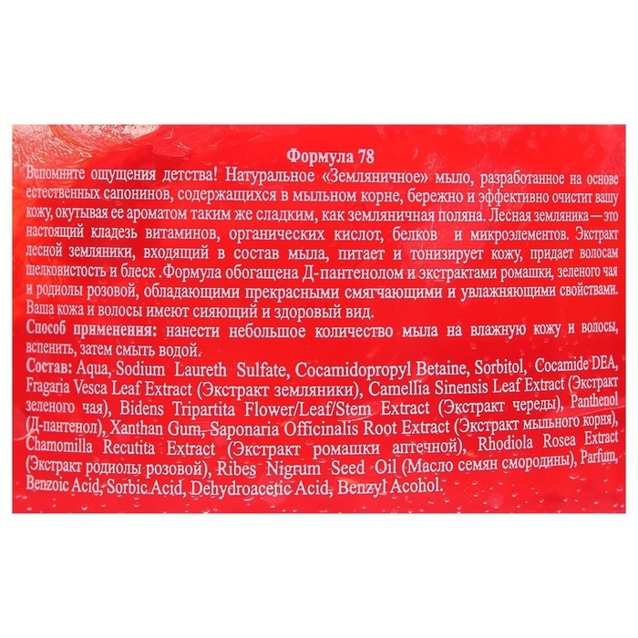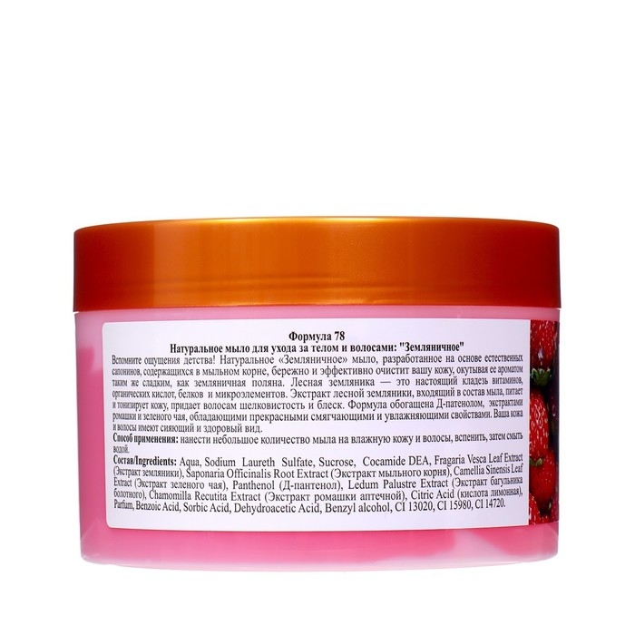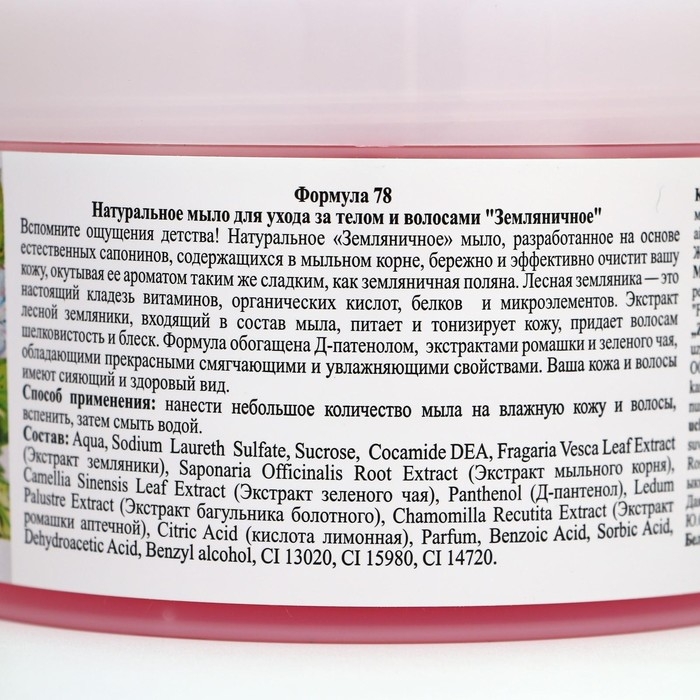 Вспомните ощущения детства! Натуральное «Земляничное» мыло, разработанное на основе естественных сапонинов, содержащихся в мыльном корне, бережно и эффективно очистит вашу кожу, окутывая ее ароматом таким же сладким, как земляничная поляна. Лесная земляника — это настоящий кладезь витаминов, органических кислот, белков и микроэлементов. Экстракт лесной земляники, входящий в состав мыла, питает и тонизирует кожу, придает волосам шелковистость и блеск. Формула обогащена протеинами козьего молока, которые обладают прекрасными смягчающими и увлажняющими свойствами. Ваша кожа и волосы имеют сияющий и здоровый вид.