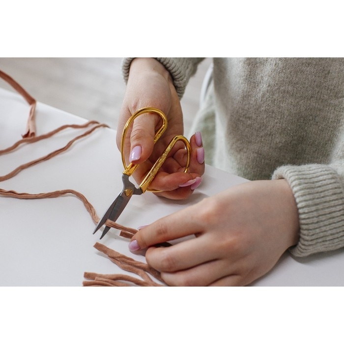 Стильные металлические ножницы с небольшими лезвиями помогут аккуратно обрезать нитки, края изделия и другие мелкие детали.
